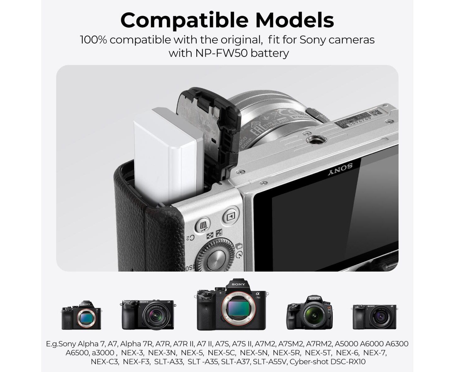Bateria de reposição NP-FW50, é perfeitamente compatível com câmerasSony Alpha 7, A7, Alpha 7R, A7R, A7R II, A7 II, A7S, A7S II, A7M2, A7SM2, A7RM2, A5000 A6000 A6300 A6500, a3000 , NEX-3, NEX-3N, entre outras