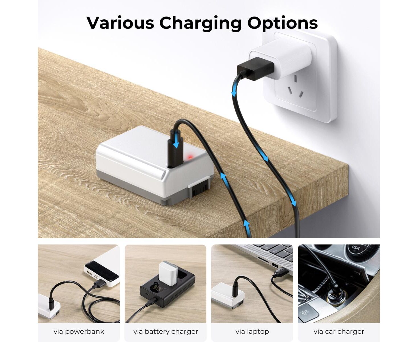 Pode ser carregado diretamente com o cabo de carregamento Tipo C e também é compatível com o carregador dedicado N-FW50.