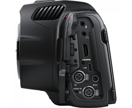 Embora seja compacta e portátil, a Blackmagic Pocket Cinema Camera inclui uma ampla variedade de conexões para áudio, monitoramento, alimentação, entre outras. A câmera inclui um conector HDMI de tamanho padrão para monitoramento com suporte para HDR e saída de 10 bits limpa. Isso significa que você pode conectar uma tela HDMI para monitoramento de imagens no set com ou sem sobreposições exibindo informações críticas e status da câmera. Há também uma conexão miniXLR com alimentação fantasma de 48 volts para encaixe de microfones profissionais, uma entrada de 3,5 mm para microfones de câmeras de vídeo e um conector de alimentação DC profissional com trava. A porta USB-C permite conectar e gravar diretamente no seu disco de mídia.