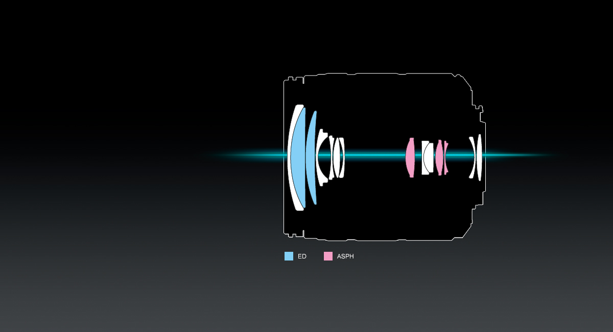 – 3 lentes asféricas – 2 Lentes ED (Extra-Low Dispersion) As lentes asféricas (ASPH) reduzem o tamanho e o peso das objetivas, prevenindo de forma eficaz as aberrações esféricas e a distorção.