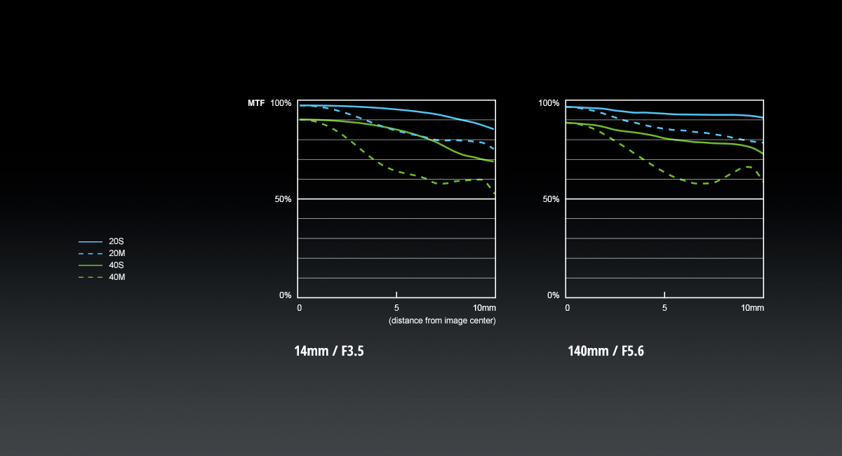 Para objetivas com capacidade de compensação da distorção, o eixo horizontal do MTF apresenta a distância do centro da imagem corrigida.