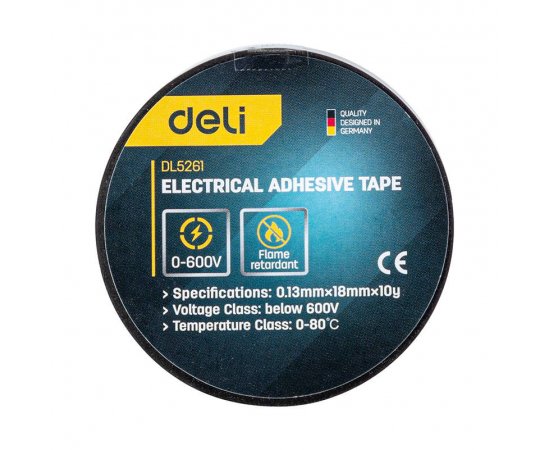 A fita isolante Deli Tools EDL5261 é útil para reparos domésticos, trabalhos elétricos e transporte. Possui alta resistência à chama e durabilidade, mantendo excelentes propriedades isolantes.