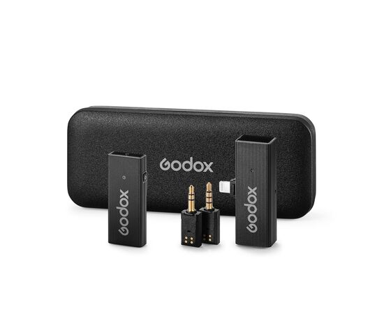 The Godox MoveLink Mini LT Kit 1 features a dual-channel receiver with a modular output design and three adapters for extensive connectivity. It is compatible with DSLR and Mirrorless cameras, audio recorders, and iOS devices with Lightning ports. A clip-on transmitter unit with an omnidirectional microphone for enhanced audio recording is included with the system. The components communicate with each other up to a distance of 328'.