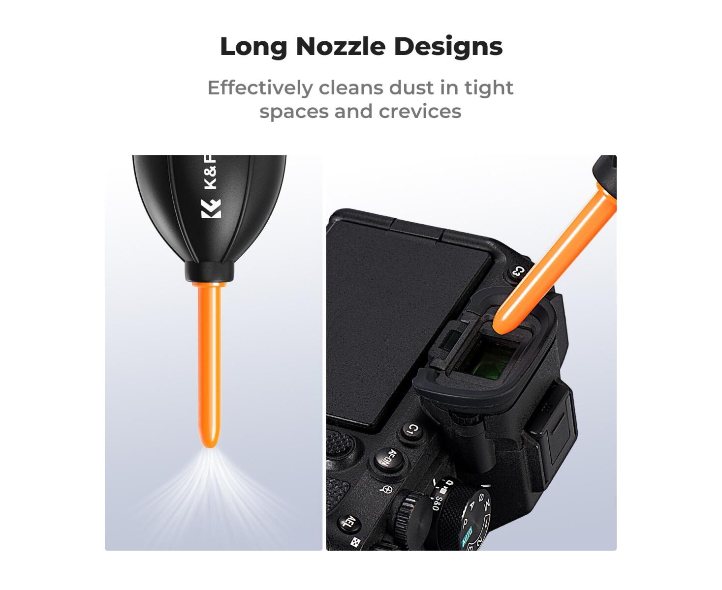 The long nozzle is best suited for cleaning deeper areas such as DSLR sensors, camera battery compartments, telescopes, keyboards, succulent plants, etc., and can effectively extend into narrow spaces and crevices.