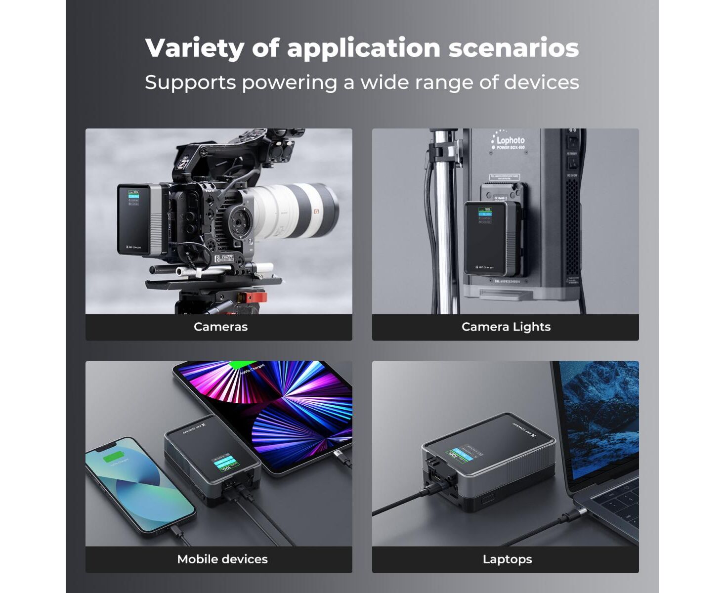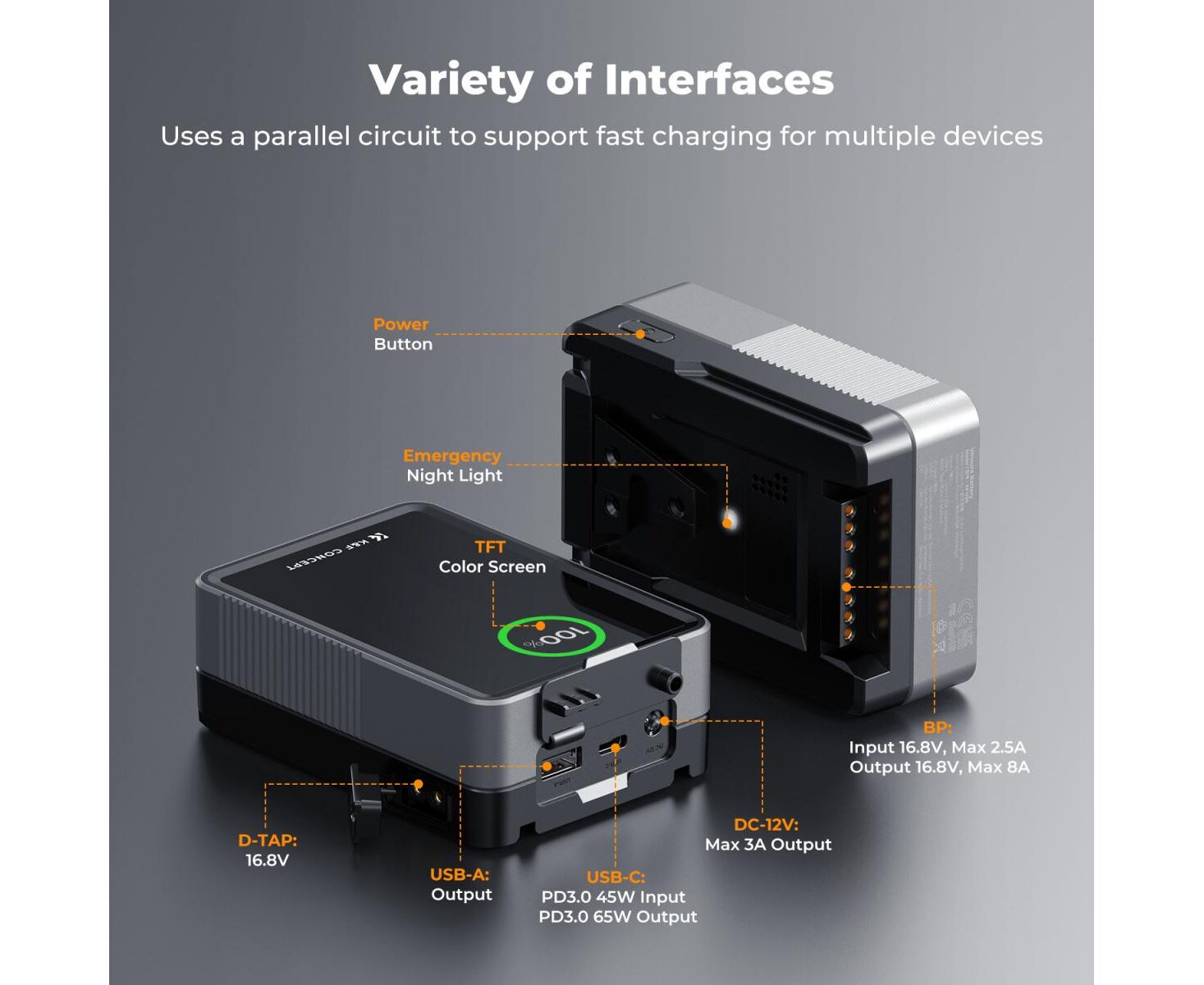 The K&F Concept 50 Wh V-Mount battery supports 65W PD fast discharge and 45W fast charge, allowing you to charge your camera, laptop, or tablet quickly.