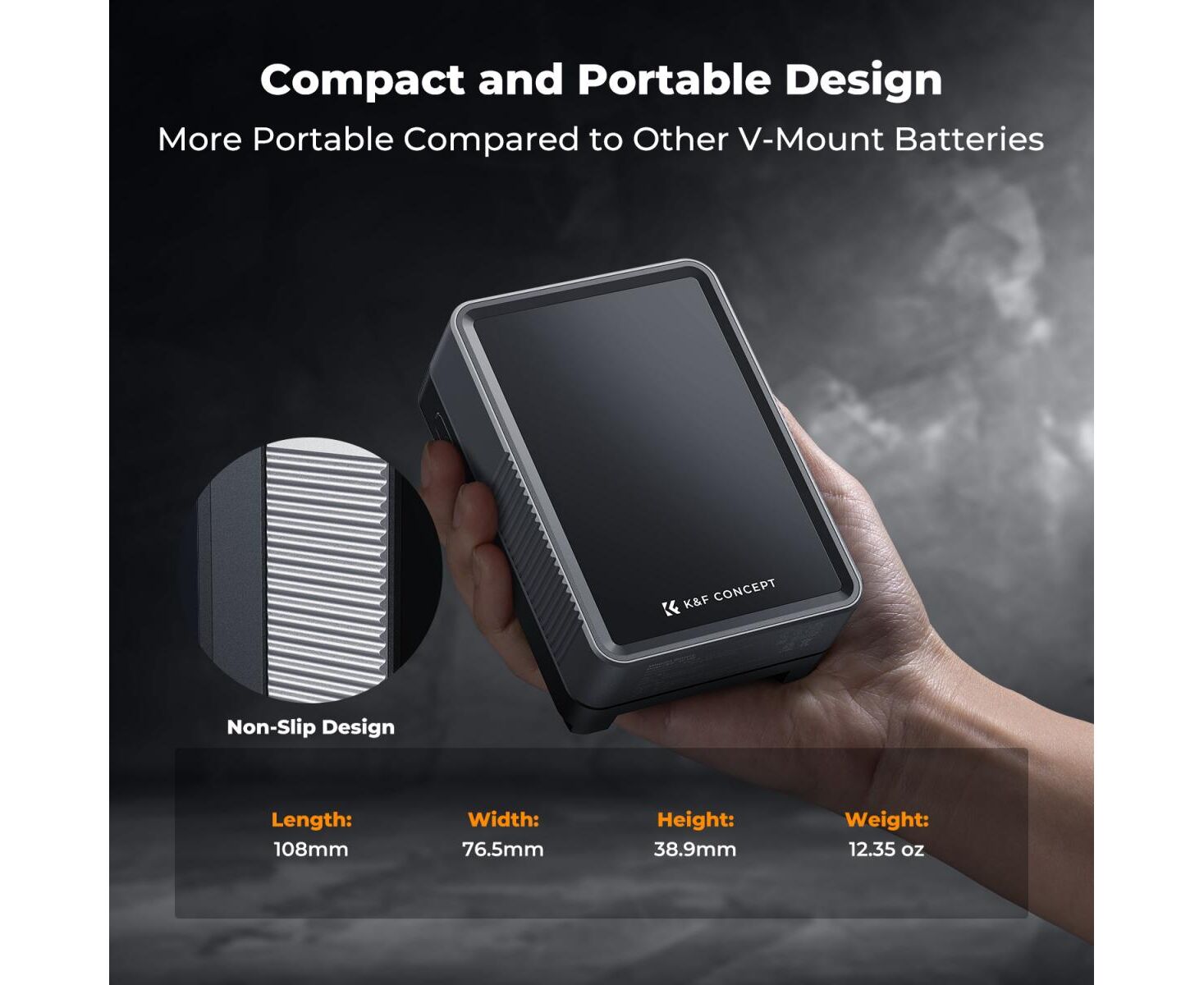 30% smaller than traditional V-mount batteries, this compact 11.7 x 7.6 x 5.7 cm battery weighs just 355 g.