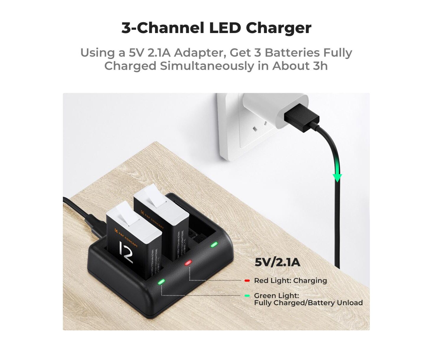 Portable and easy-to-use 3-channel LED charger for GoPro Hero 9/10/11/12 batteries, you can charge three batteries individually or at the same time, and each channel has an indicator light to remind you.
