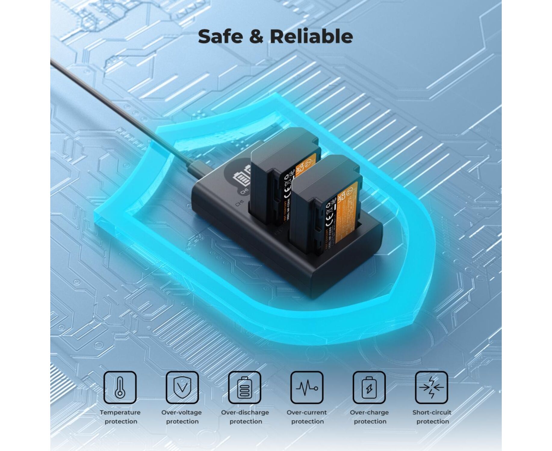 The battery and charger have comprehensive safety protection features, including overcharge, high temperature, overcurrent, overvoltage, and short circuit protection.