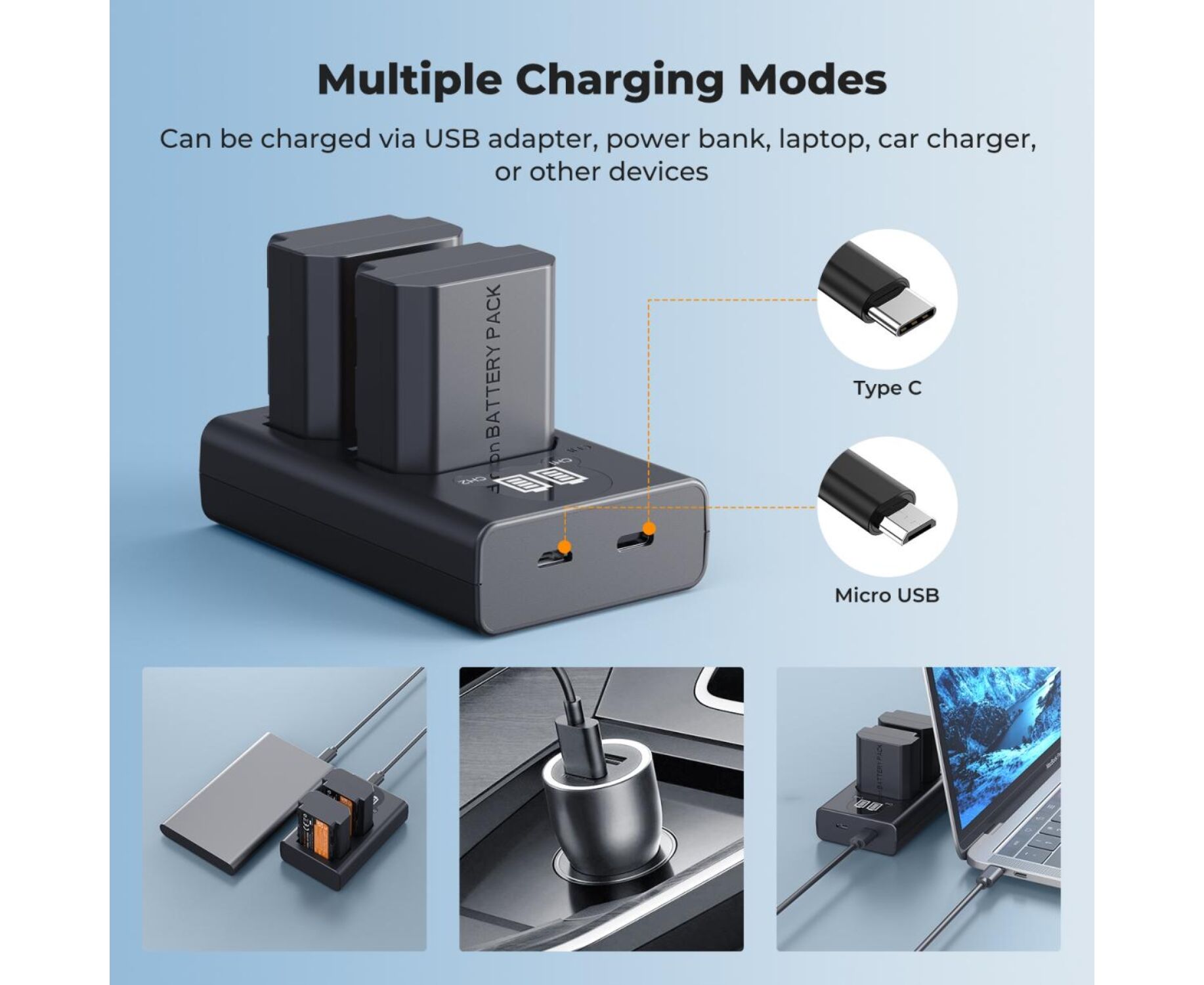 The charger is equipped with Type-C and Micro USB inputs, which adapt to a variety of charging methods, such as USB wall adapter, mobile phone charger, car charger, laptop, or mobile power supply, and it is recommended to use 5V 2.1A or more current output;