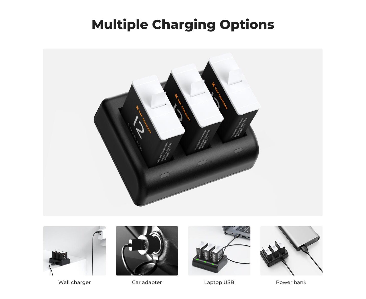 Portable and easy-to-use 3-channel LED charger for GoPro Hero 9/10/11/12 batteries, which can charge 3 batteries individually or simultaneously. Each channel has an indicator light.
