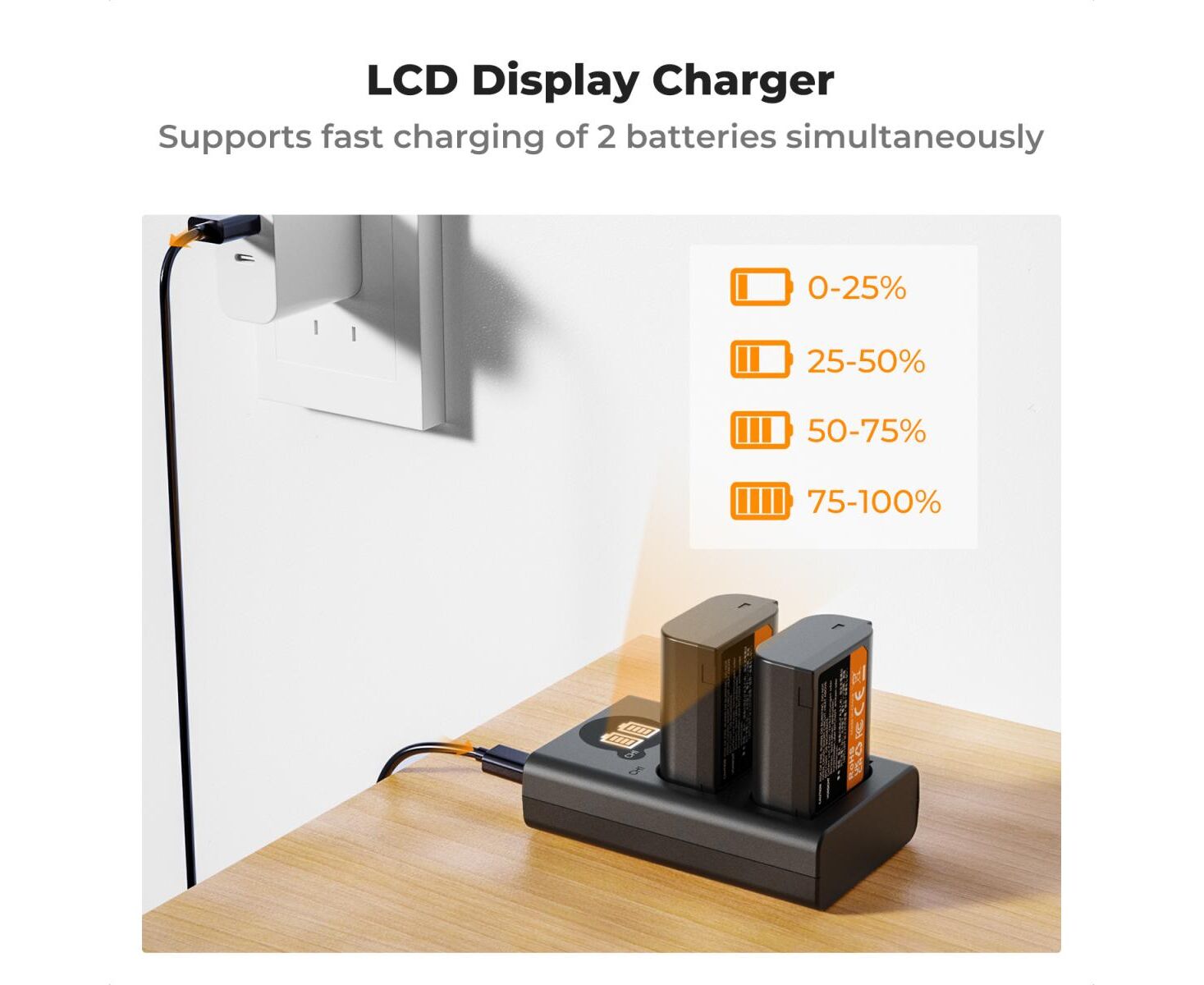 With two high-capacity batteries (2400 mAh) and a smart dual charger, this kit offers a complete solution to extend shooting sessions without interruptions. The built-in LCD screen allows you to monitor the charging status of each battery in real time, ensuring full control over the process.