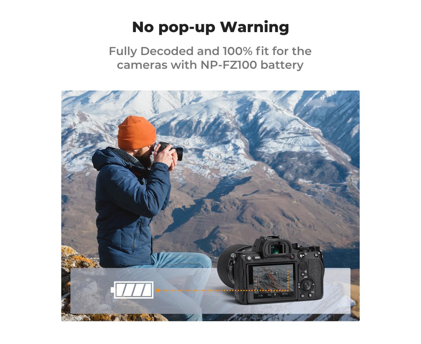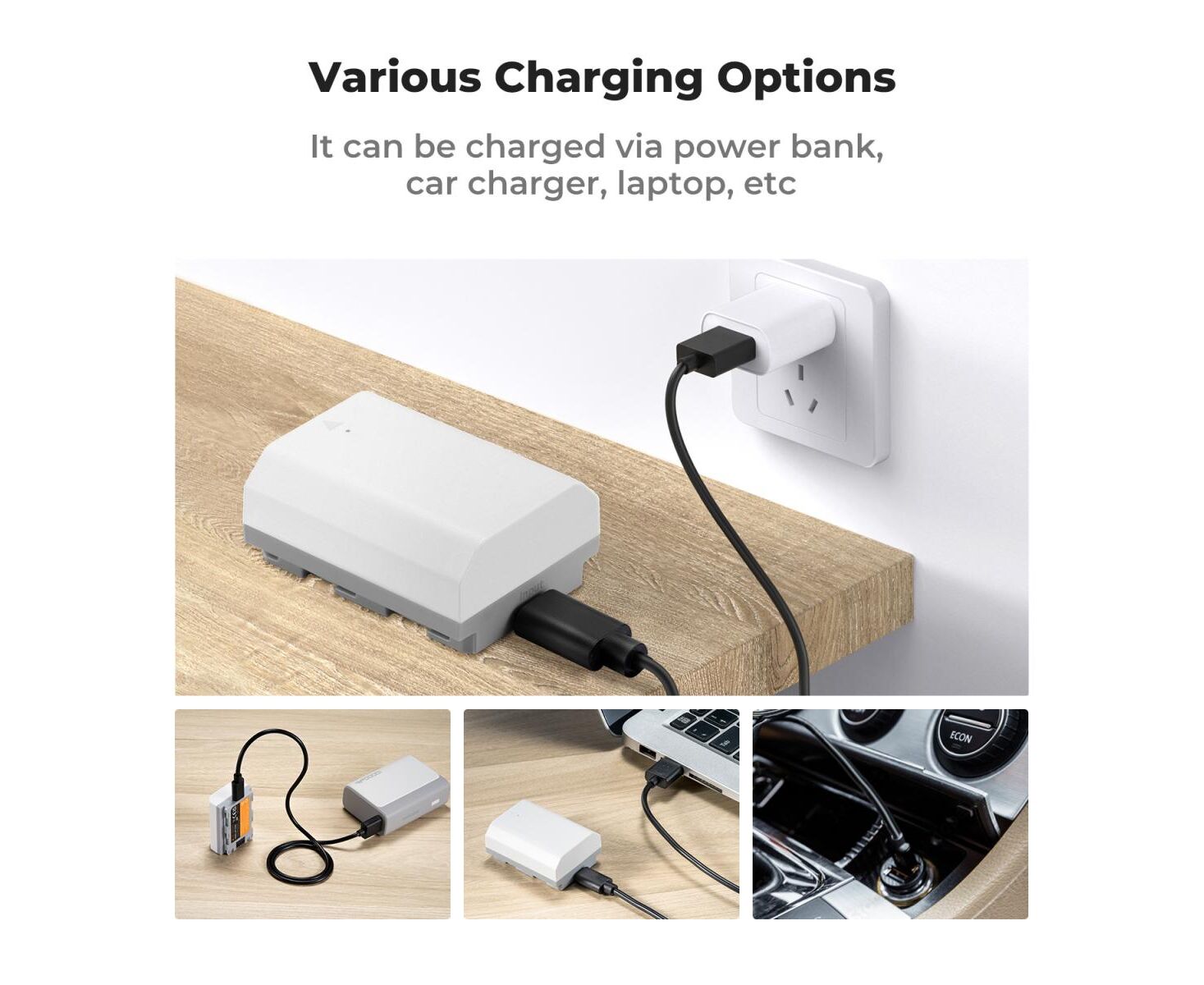 It can be charged via USB wall charger, car charger or power bank, meanwhile, it is compatible with the NP-FZ100 charger.