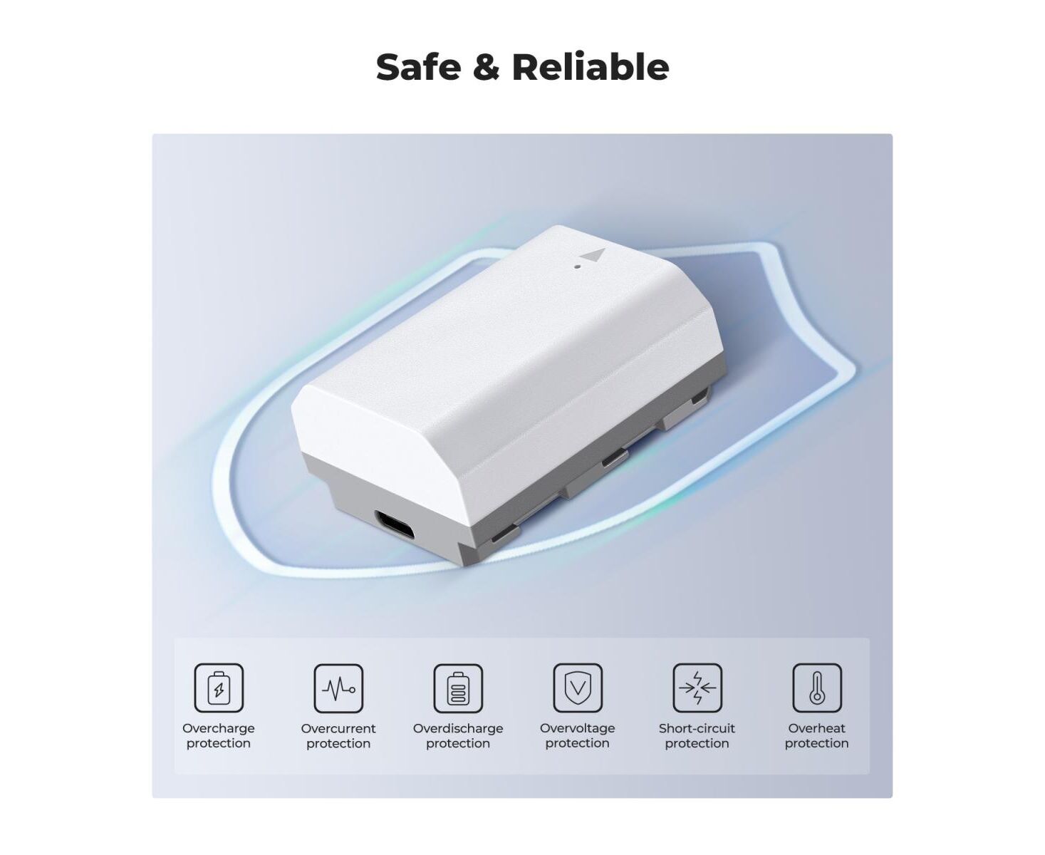 It is safe and reliable with 6 protections, temperature protection, over-voltage protection, over-discharge protection, over-current protection, charger overload protection and short circuit protection.