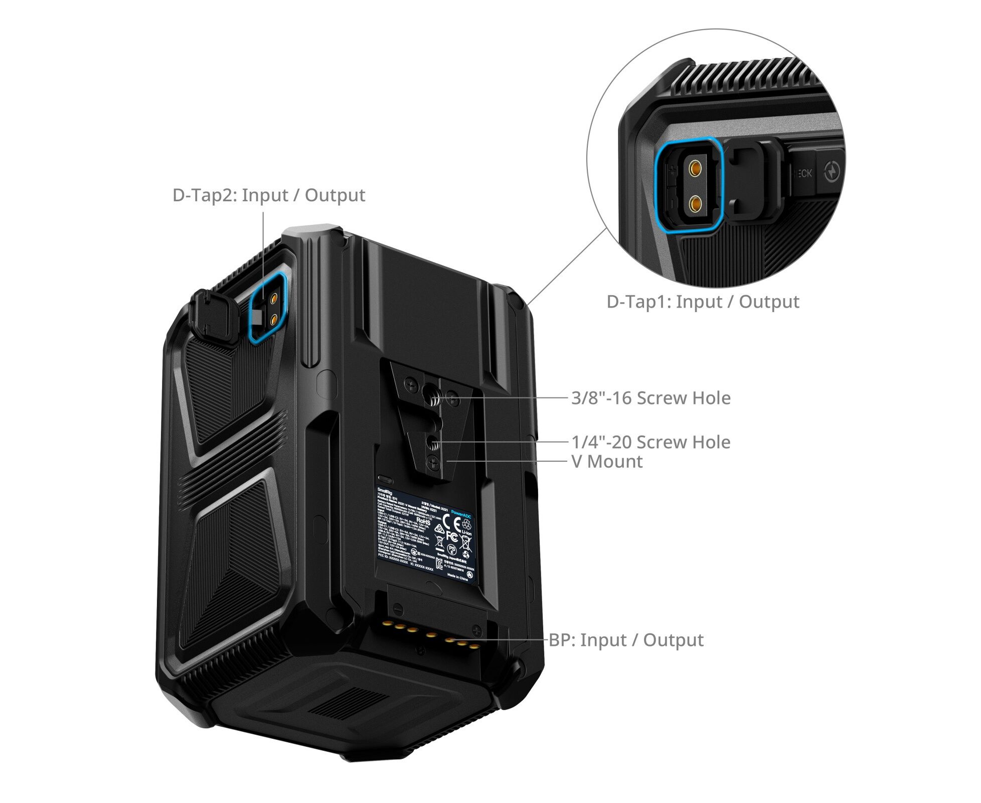 Mounting options include 1/4"-20 and 3/8"-16 threaded holes, complemented by a backlight indicator for quick and accurate installation, even in low light. These professional-grade features make the X221 the ideal companion for field shooting, providing filmmakers with energy security in all weather conditions and allowing creators to focus entirely on content production without worrying about power issues.