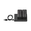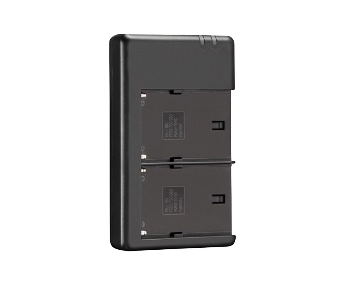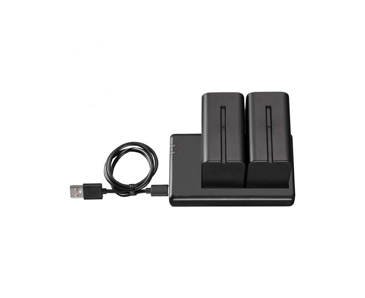 The dual charger uses a USB connection for power, so you don't need to carry a power supply. Simply plug the charger into a standard USB charger or a USB transformer (all require a minimum voltage of 2.1A), making this pack a truly portable power solution for your lighting.
