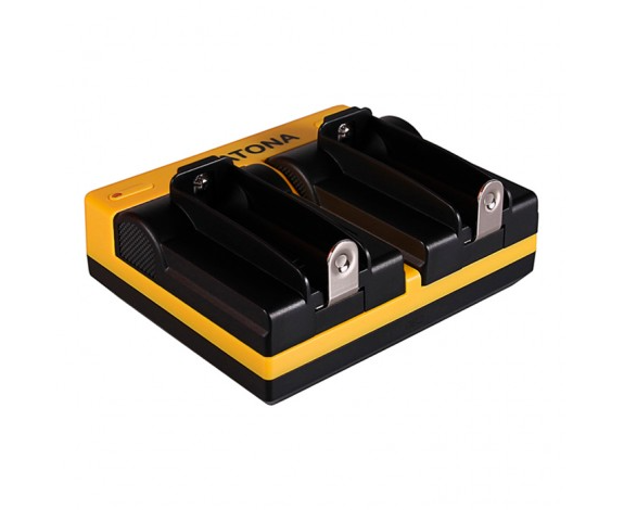 Dual USB charger for 18650 batteries. The battery plates are removable and can be swapped to charge other types of batteries.