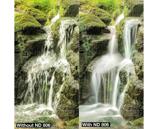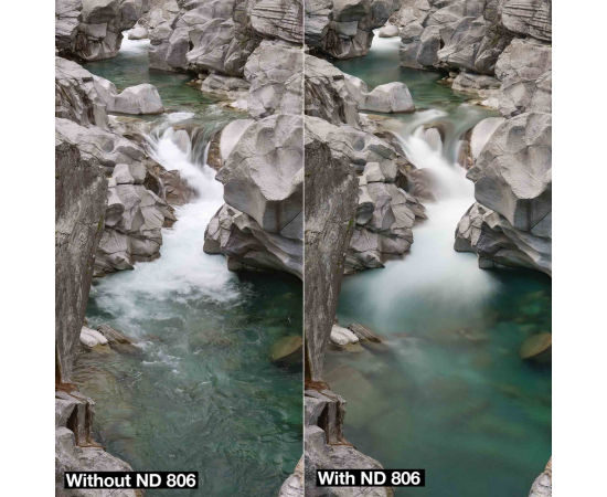 This B+W gray filter reduces the light by three f-stops. This neutral density filter is particularly interesting for video, when it is not possible to set an appropriate aperture value at high brightness or when a deliberately low depth of field is desired. With this filter strength, a clear flow effect can already be seen in the water. The B+W 103 ND 0.9 neutral density filter is also Ideal for engravings with a blurred effect.