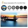 A filter that simultaneously has ND and CPL filter capabilities: In addition to reducing the amount of light entering the lens, it also organizes the flow of light passing through the lens, to ensure more saturated colors and elimination of reflections on reflective surfaces such as glass and water