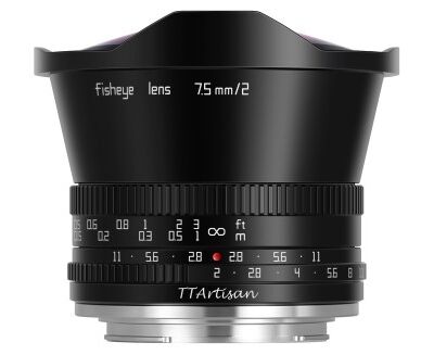 This dynamically wide 7.5mm f/2.0 fisheye lens from TTArtisan fills the image area of an ASP-C image sensor from corner to corner. When used on a camera with a full-frame image sensor, the circular fisheye image is heavily vignetted at all four corners.