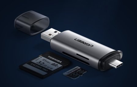 The UGREEN 2-in-1 card reader allows data transmission of up to 5 Gb per second.