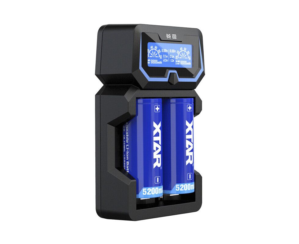 The Xtar X2's backlit LCD display shows the charger's operating status in real time: Rechargeable batteries expressed in mAh, battery voltage, and charging current.