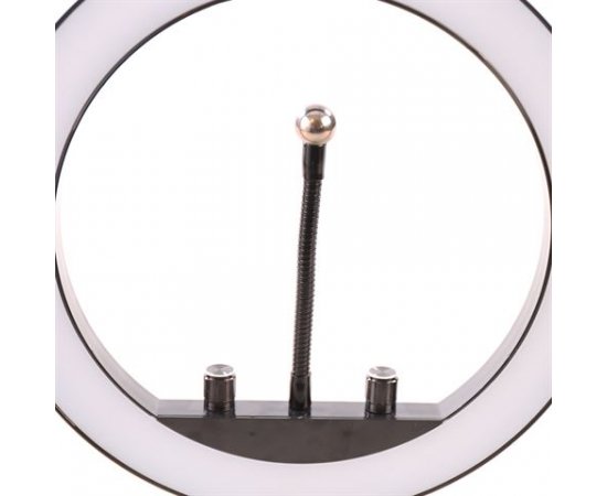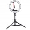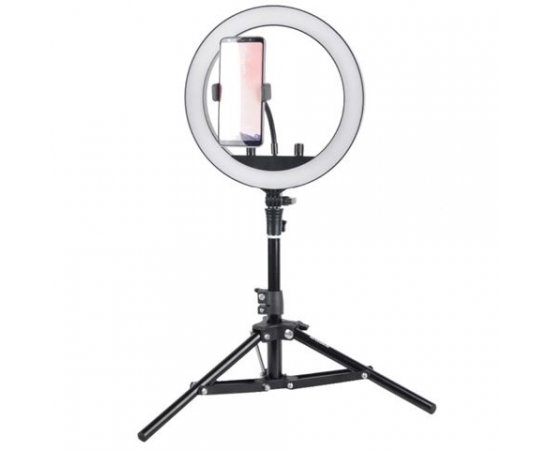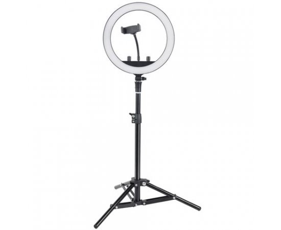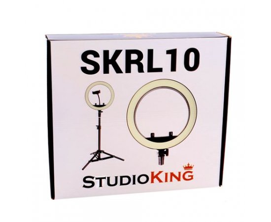 The StudioKing Ring Illuminator Bicolor SKRL10 set is a universal kit consisting of an adjustable bi-color LED ring illuminator, table tripod and smartphone holder.