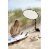 The unique, patent-protected Difflector fabric comprises our standard diffuser surface with a silver stripe. This means that the HaloCompact will allow light to pass through as a diffuser on one side and reflect the light off the silver stripes on the other side, making it a single, true, dual diffuser and reflector panel.