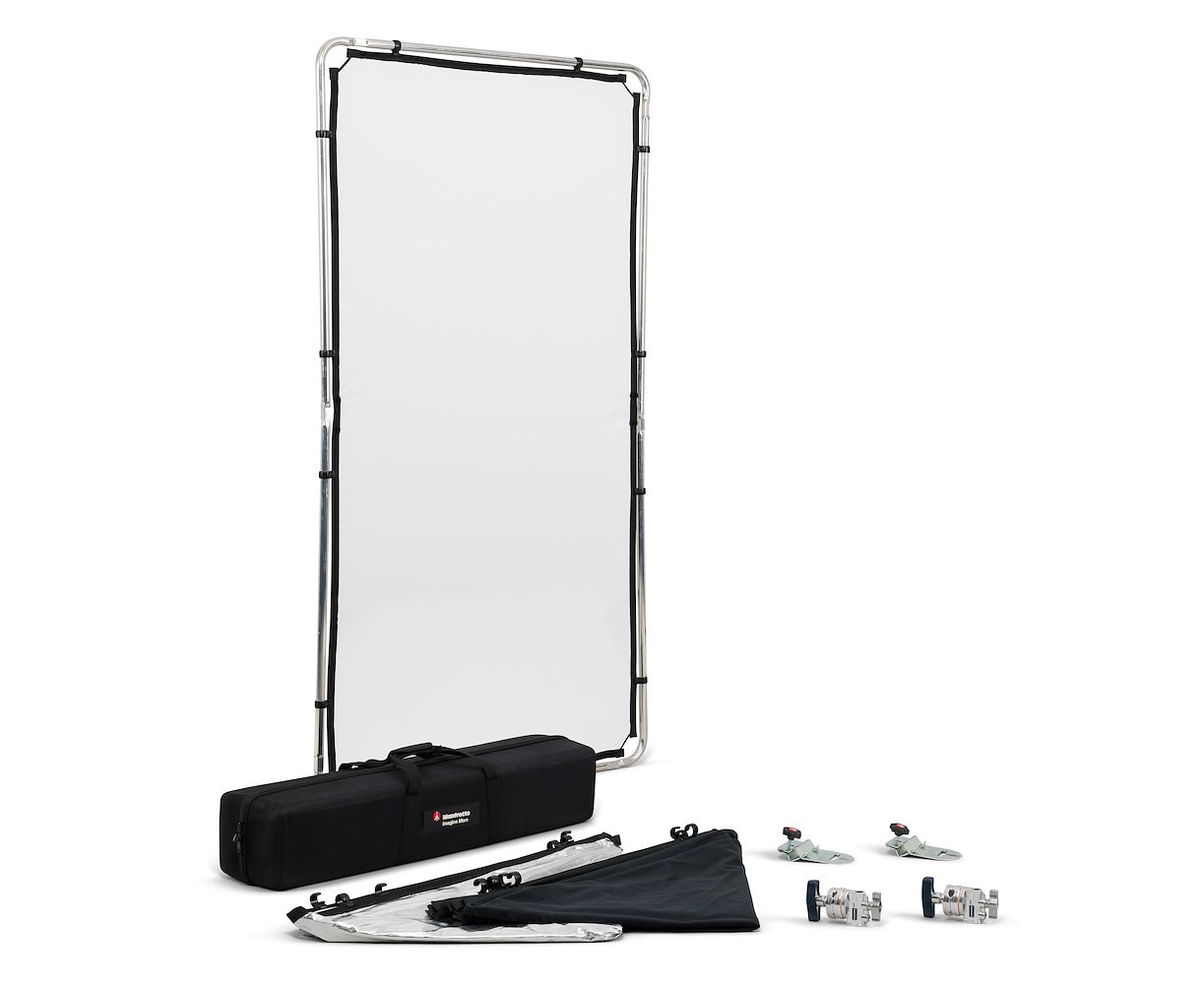 The Pro Scrim 'All in One' kit includes all the essential components image-makers need to control their lighting setup, bouncing, diffusing or marking their light sources. These components allow the user to complete their entire setup with a single compact and easy-to-carry kit, ideal for demanding professionals who want to keep all their possibilities open while working on the go with maximum lightness and portability.