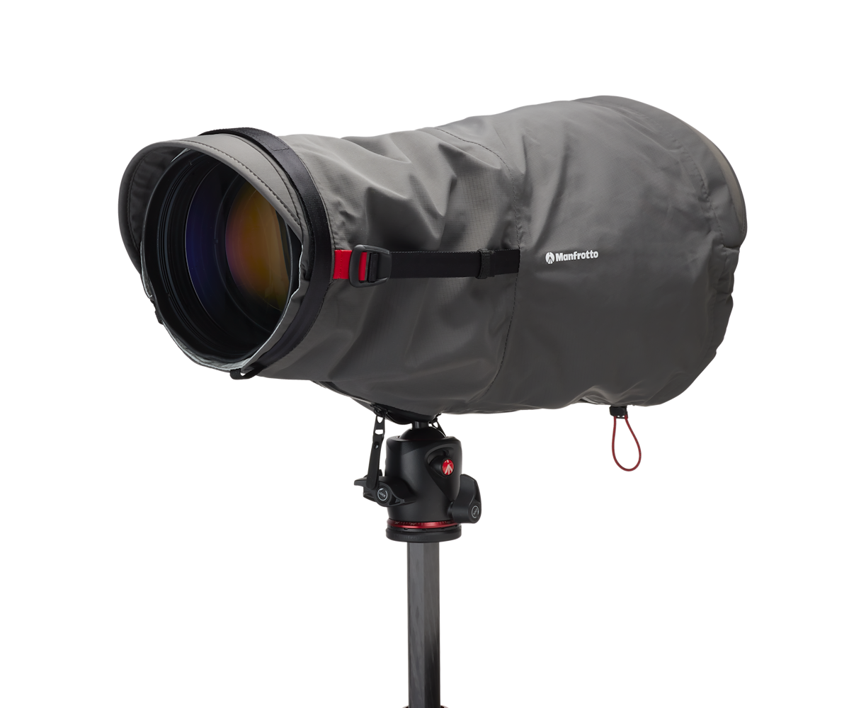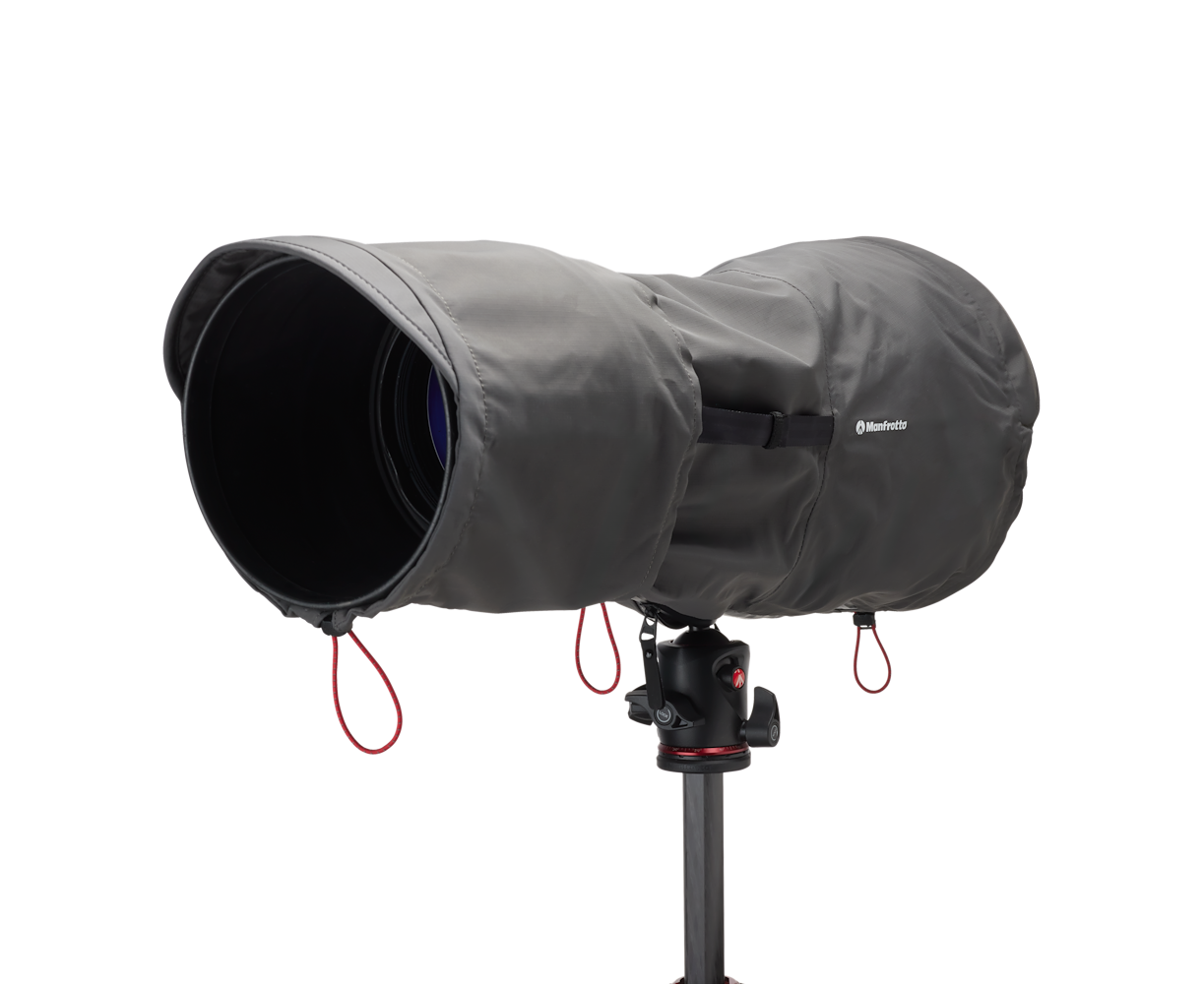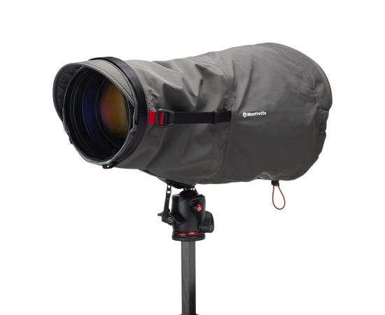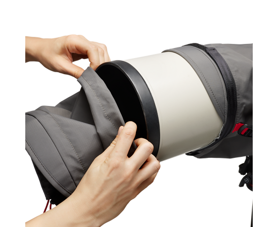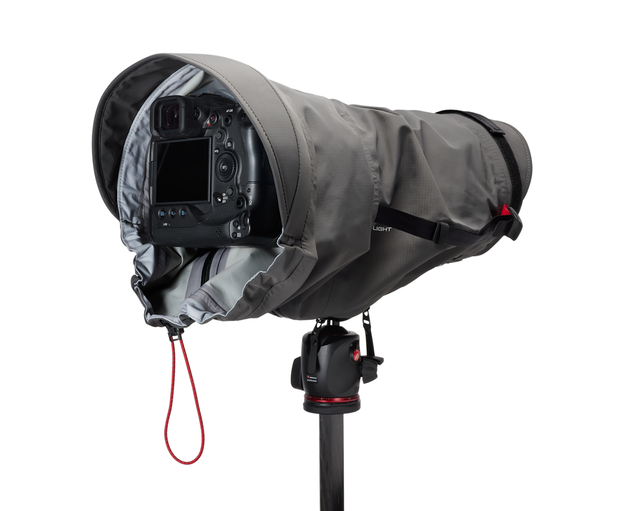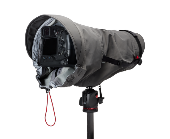 This versatile rain cover is designed to protect your camera equipped with a super-telephoto lens from the elements, whether it's rain, sand, or mud. Compatible with DSLR and mirrorless cameras, it is adjustable in diameter and length, and its secure strap with velcro mechanism ensures a perfect fit for telephoto lenses up to 600 mm/2.8.