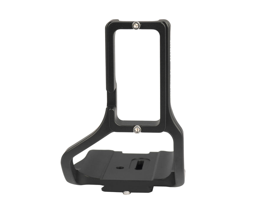 This L-mount allows you to switch the camera position between landscape and portrait without removing the release plate. The tripod or head also does not need to be realigned. The angle is made exactly for the camera with battery grip and fits the camera perfectly. All controls and connections remain accessible.