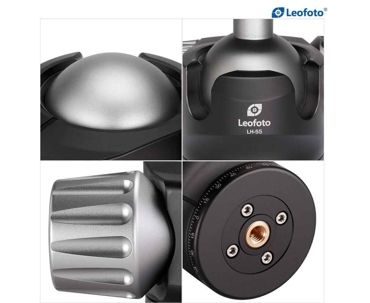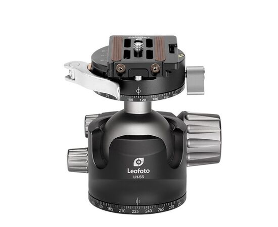 Leofoto Ball Head LH-55PCL 55 mm with low center of gravity and PCL-60 panoramic clamp and NP-60 plate.