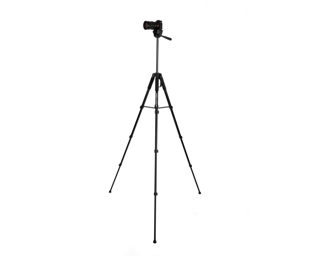 The tripod legs are extendable and consist of 4 sections. The center column is adjusted by a crank to precisely regulate the height of the camera.