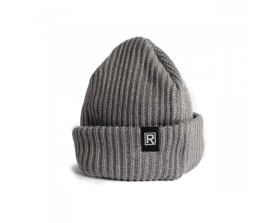 Charcoal grey acrylic knitted beanie with fabric label with BLACKRAPID R logo.