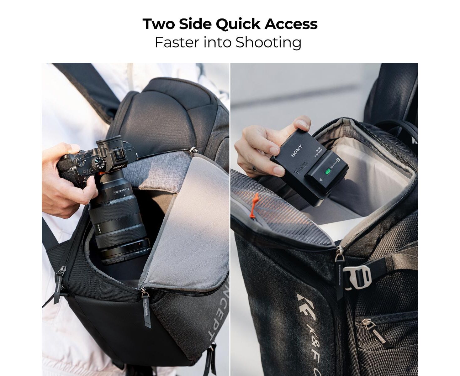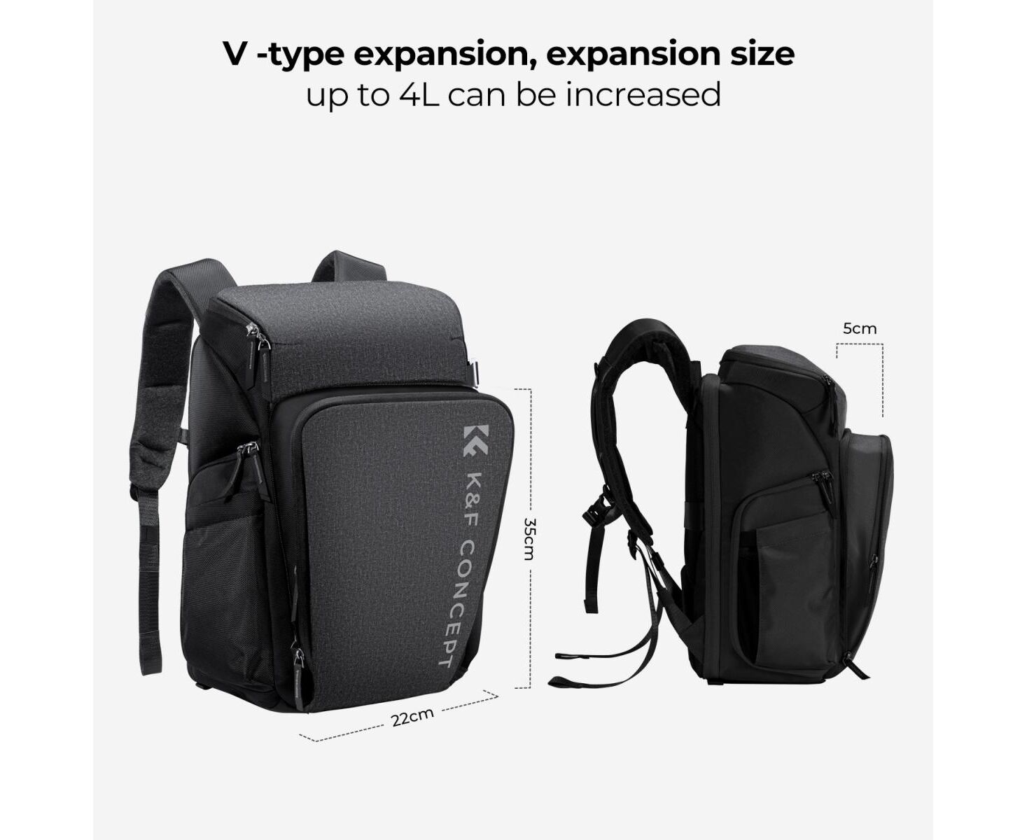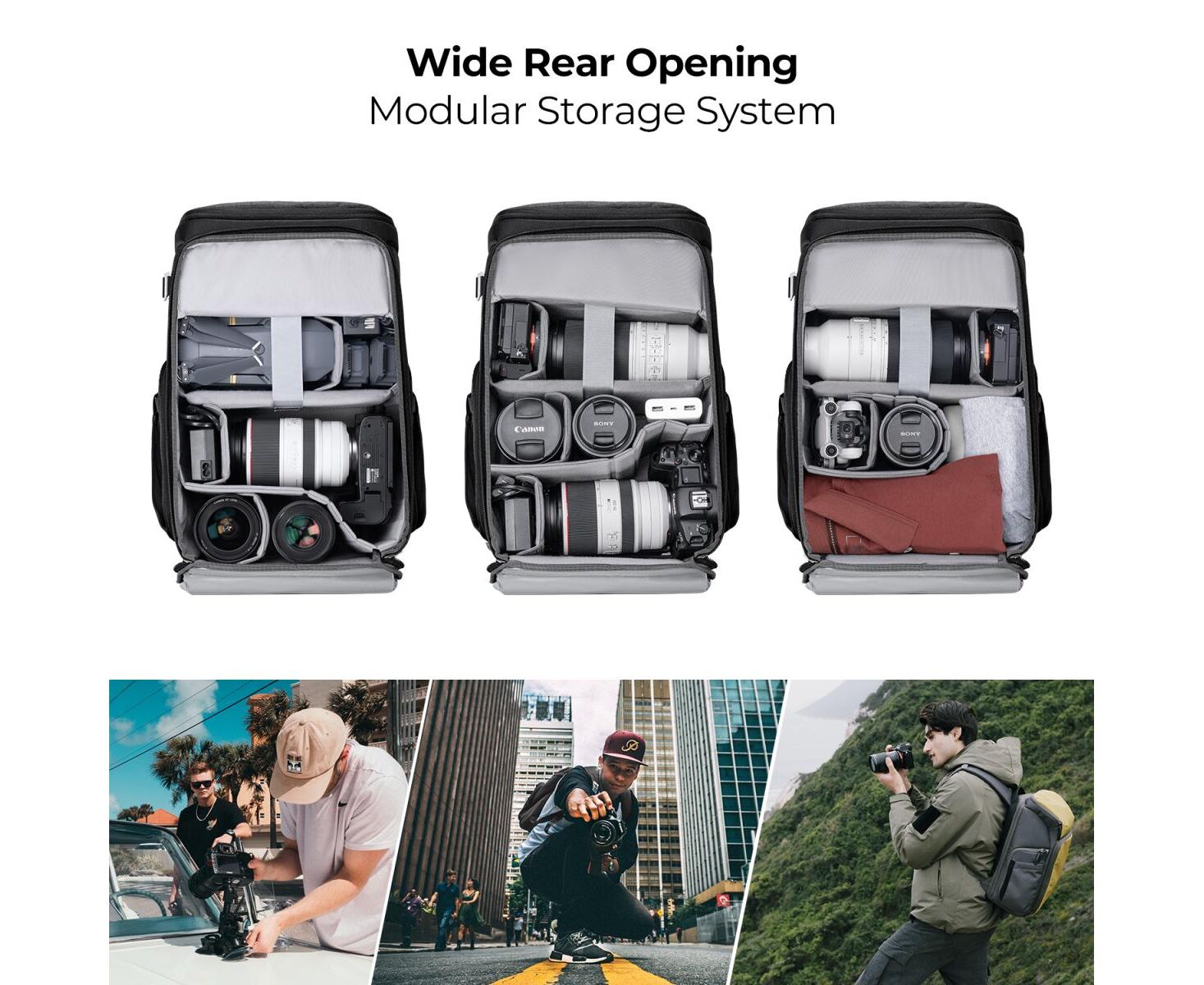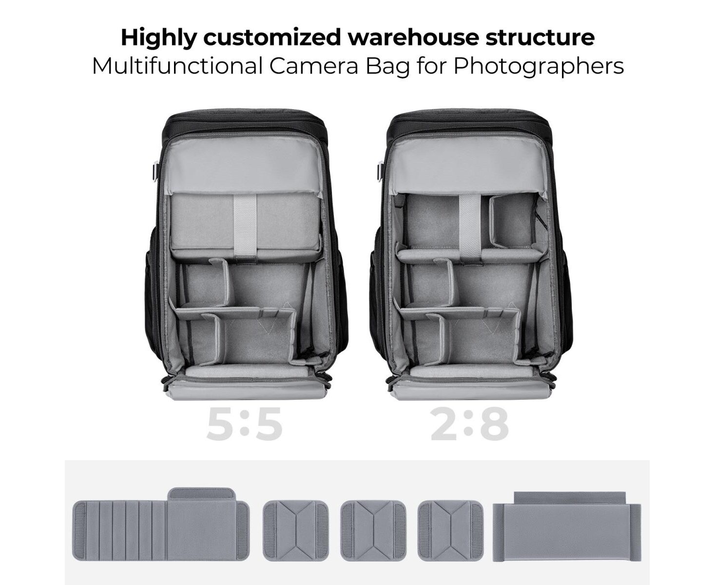This photo backpack can be carried in 5:5 and 2:8 space by pushing up or down for different needs. Suitable for outdoor photography, urban street photography, outdoor portraits, VIOG photography, etc.