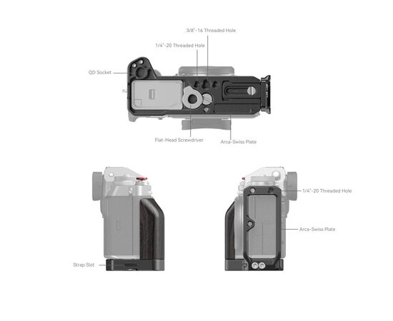 In addition, the side plate has 1/4"-20 threaded holes for attaching the Cold Shoe Mount BUC2736 for microphone, etc. and can be stretched to allow cable passing.