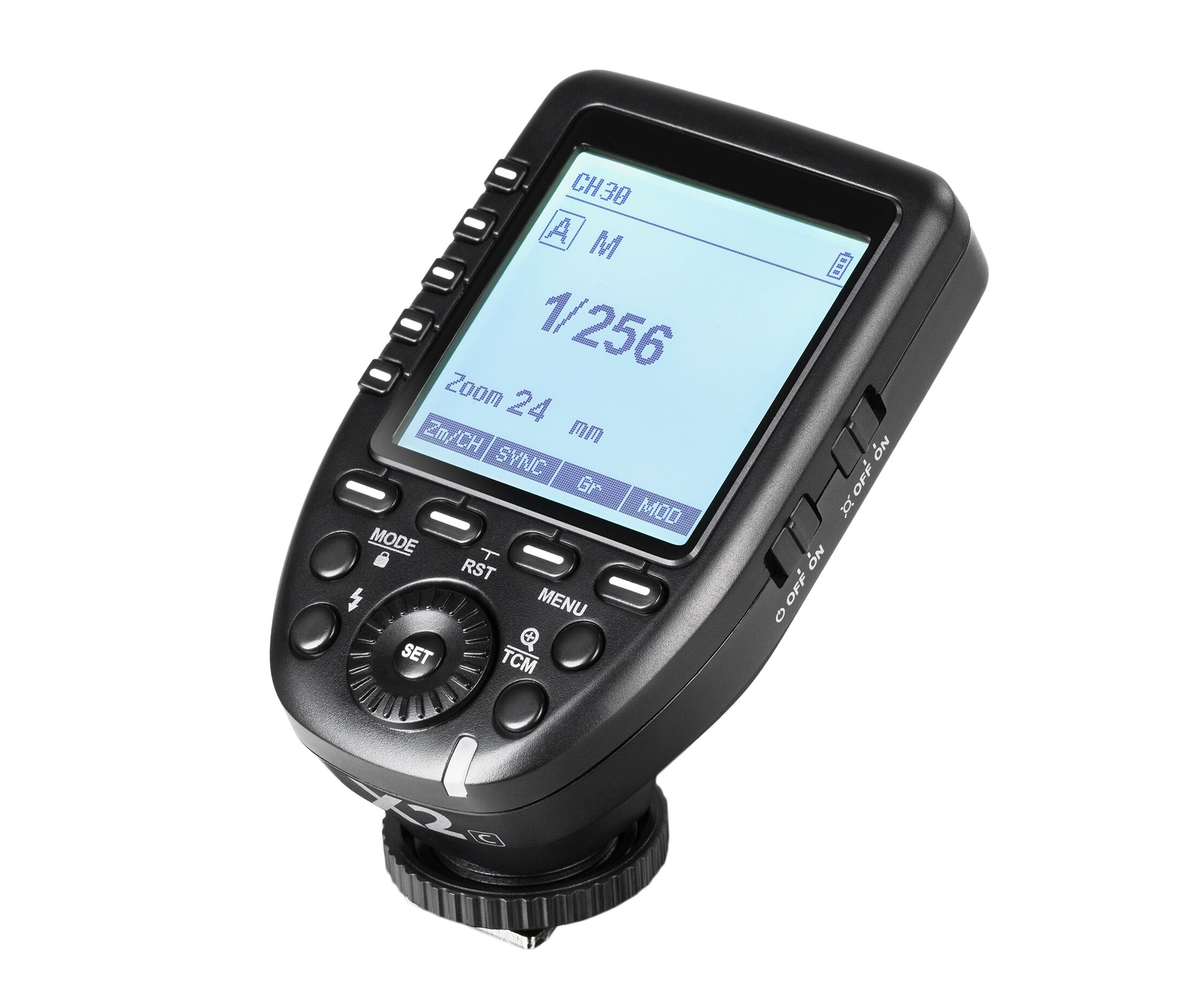 Graças à sua grande tela LCD de matriz de pontos com iluminação de fundo, o usuário pode controlar até 5 grupos de flash simultaneamente, incluindo sua função de zoom, compensação de exposição do flash e status da luz de modelagem.