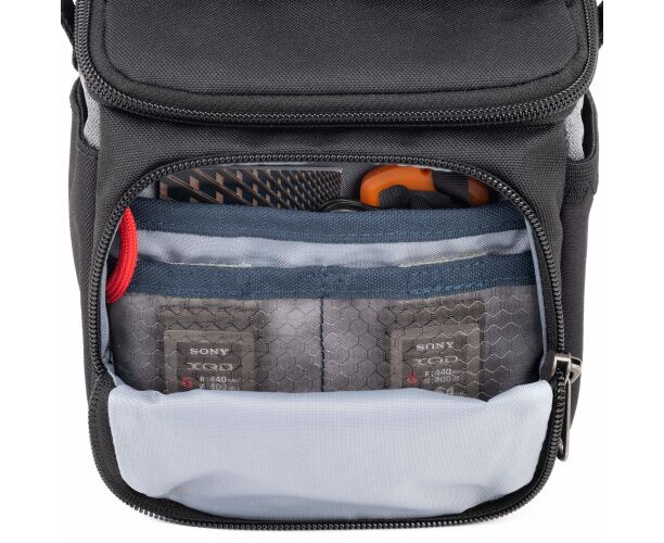 A bolsa foi concebida para transportar e proteger câmaras mirrorless modernas e respetivos acessórios. A alça de ombro é removível e a passagem para cinto permite utilizá-la como pochete. A tampa articulada com fecho magnético garante acesso rápido e cómodo ao equipamento. Os fechos YKK RC de elevada qualidade e as ferragens metálicas asseguram resistência e durabilidade. O bolso frontal com fecho inclui um organizador para acessórios. Existem compartimentos dedicados e seguros para cartões de memória CF, SD, XQD ou Micro SD. Os bolsos laterais elásticos e reforçados permitem guardar acessórios adicionais. Sob a tampa existe um compartimento extra para baterias ou objetos compactos. A bolsa inclui ainda um gancho para chaves com cordão e uma pega superior para transporte rápido. Os tecidos possuem tratamento repelente à água e é fornecida uma capa de chuva com costuras seladas para maior proteção.
