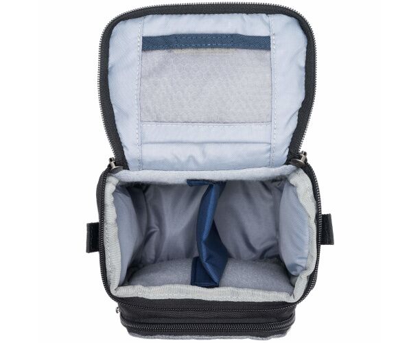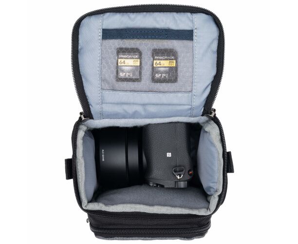 A bolsa foi concebida para transportar e proteger câmaras mirrorless modernas e respetivos acessórios. A alça de ombro é removível e a passagem para cinto permite utilizá-la como pochete. A tampa articulada com fecho magnético garante acesso rápido e cómodo ao equipamento. Os fechos YKK RC de elevada qualidade e as ferragens metálicas asseguram resistência e durabilidade. O bolso frontal com fecho inclui um organizador para acessórios. Existem compartimentos dedicados e seguros para cartões de memória CF, SD, XQD ou Micro SD. Os bolsos laterais elásticos e reforçados permitem guardar acessórios adicionais. Sob a tampa existe um compartimento extra para baterias ou objetos compactos. A bolsa inclui ainda um gancho para chaves com cordão e uma pega superior para transporte rápido. Os tecidos possuem tratamento repelente à água e é fornecida uma capa de chuva com costuras seladas para maior proteção.