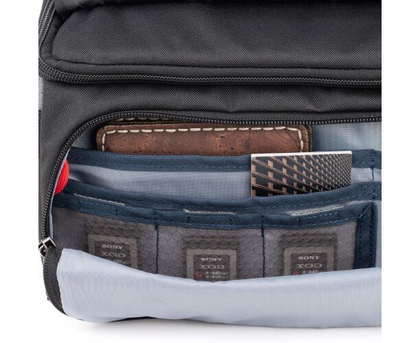 Está equipada com fechos YKK RC de elevada qualidade e ferragens metálicas resistentes. O bolso frontal com fecho facilita o acesso a acessórios e inclui um organizador interno. Dispõe de compartimentos dedicados e seguros para cartões CF, SD, XQD ou Micro SD, bem como bolsos laterais elásticos reforçados para acessórios adicionais.