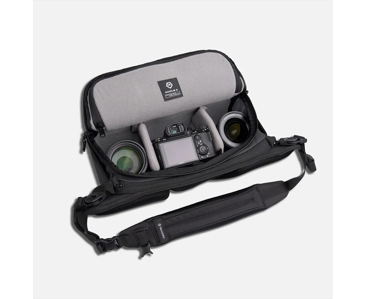 Internamente, encontrará armazenamento personalizável com duas divisórias acolchoadas, bolsos organizadores em tela, um suporte para caneta, um bolso para AirTag, ranhuras para cartões SD, um gancho dedicado para chaves e um suporte patenteado para portátil que acomoda um MacBook Pro até 16". No exterior, a ROGUE 9L possui materiais resistentes às intempéries, dois deslizadores de fecho no acesso principal, um bolso plissado para garrafa de água/tripé, alças integradas para acessórios, dois bolsos laterais em tela e um sistema de transporte redesenhado que se adapta aos seus movimentos.