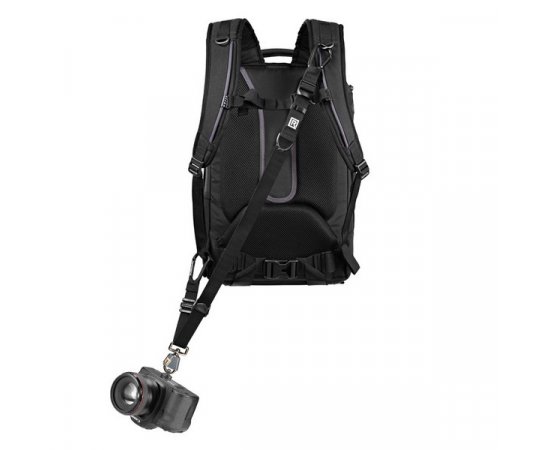 Correia para câmera projetada para conectar-se à parte traseira da mochila.