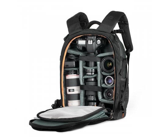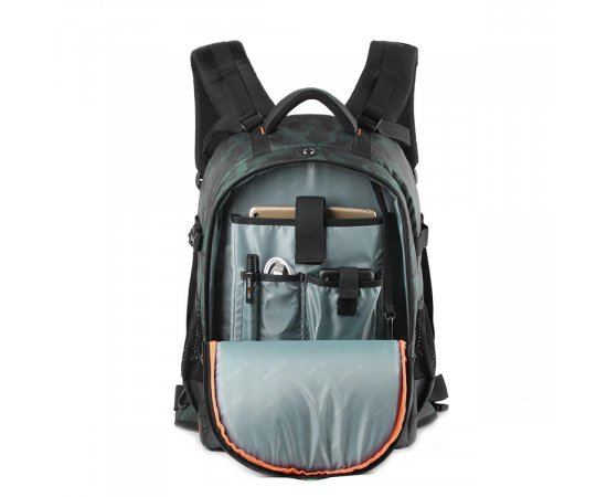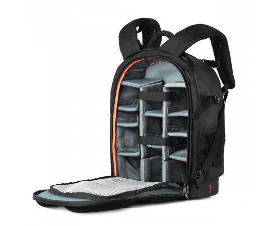 O meio espaço para cima pode armazenar roupas ou acessórios de viagem, e o meio espaço para baixo tem uma inserção de câmera separada que pode ser retirada de forma rápida e fácil pelo acesso do lado esque