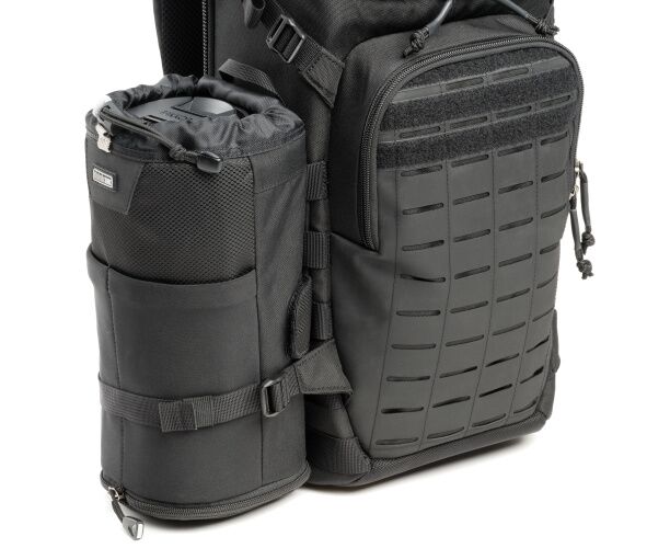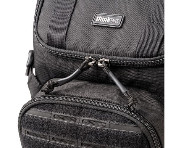 - Trilhos laterais para fixação de fitas táticas permitem acoplar bolsas modulares Think Tank.