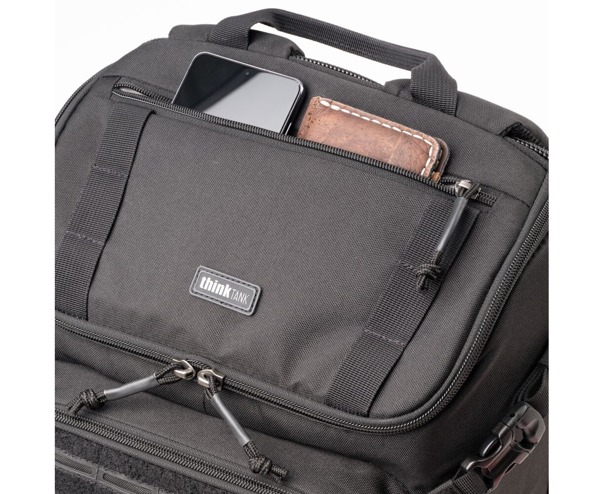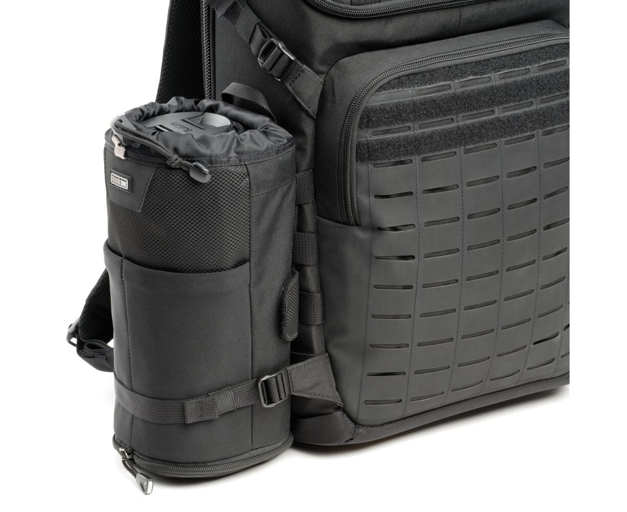 - Trilhos de correias táticas na lateral permitem que você prenda bolsas modulares Think Tank