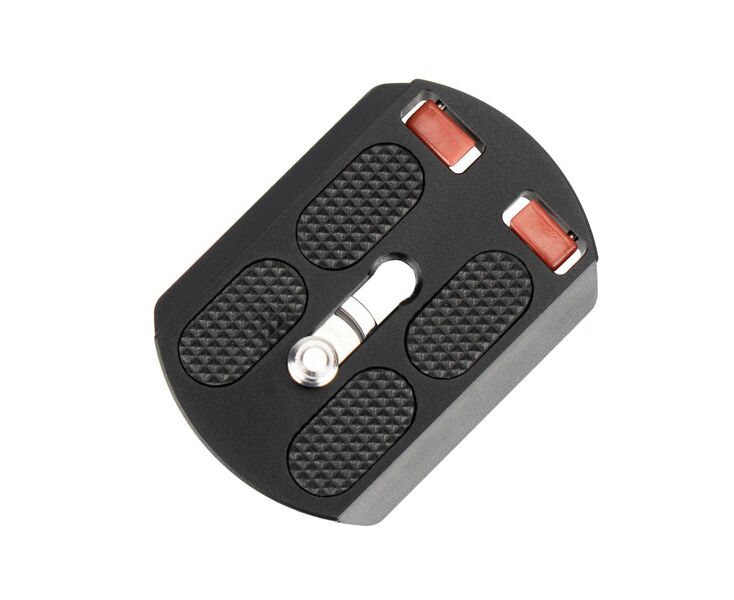 Esta placa de aperto rápido da SIRUI possui um parafuso com uma rosca padrão de 1/4" e uma superfície emborrachada.