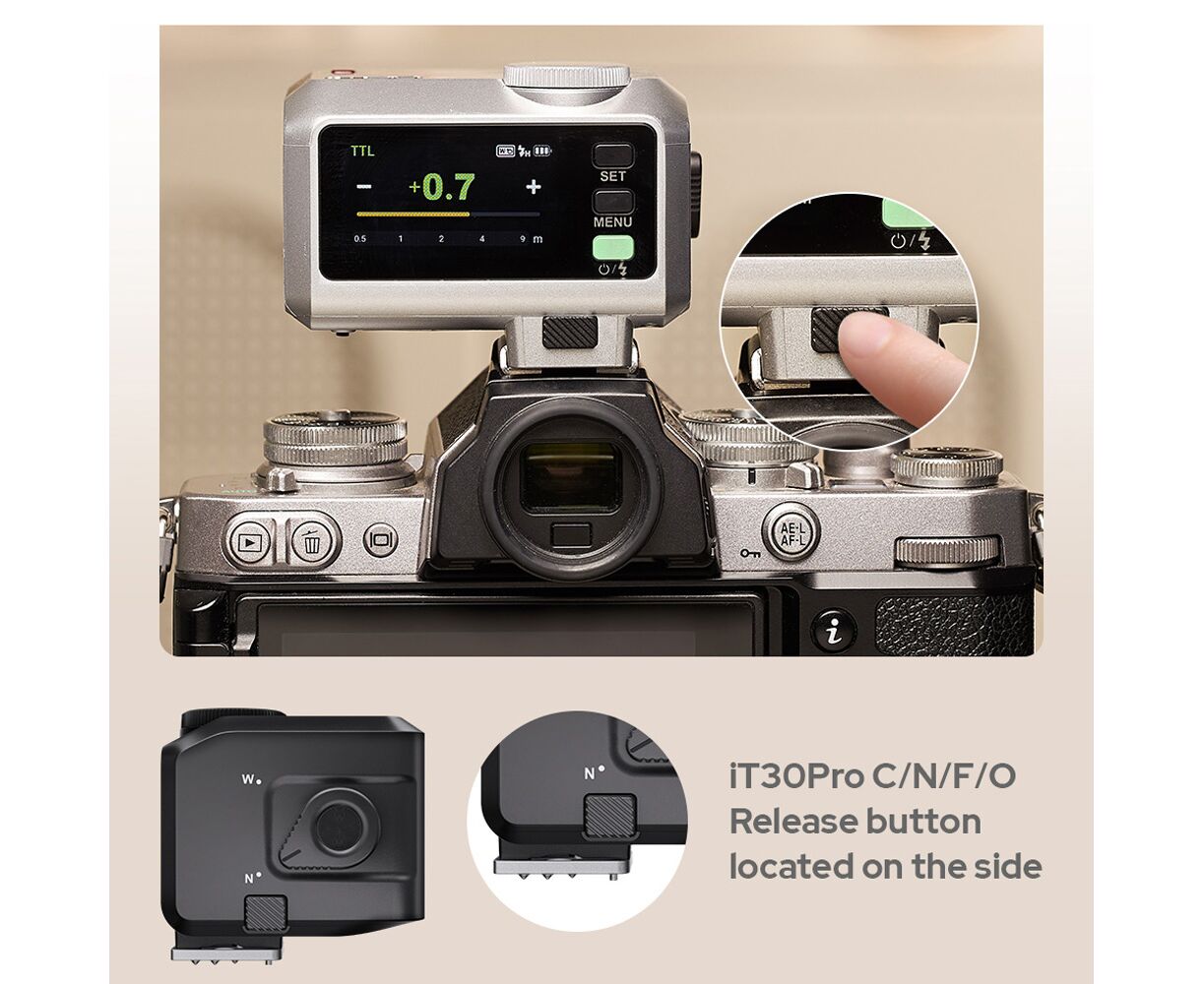 O iT30 Pro possui um ecrã táctil que permite navegar pelas definições e ajustar a potência com apenas um toque, perfeito para ajustes rápidos. Prefere feedback tátil? O botão rotativo tradicional permite ajustar a saída do flash exatamente como pretende.