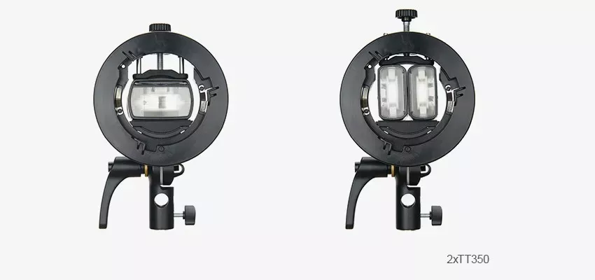 Sistema de montagem exclusivo para flashes compactos com encaixe para acessórios Bowens.