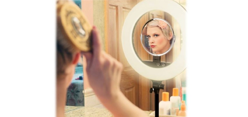 Coloque o espelho de maquilhagem incluído e o suporte de telefone na lâmpada anelar e pode começar.