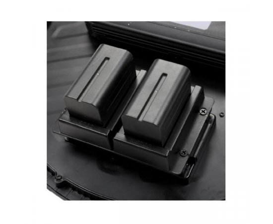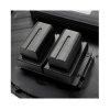 É alimentado através de um adaptador AC (incluído) ou através de uma bateria NP-F (adaptador não incluído).