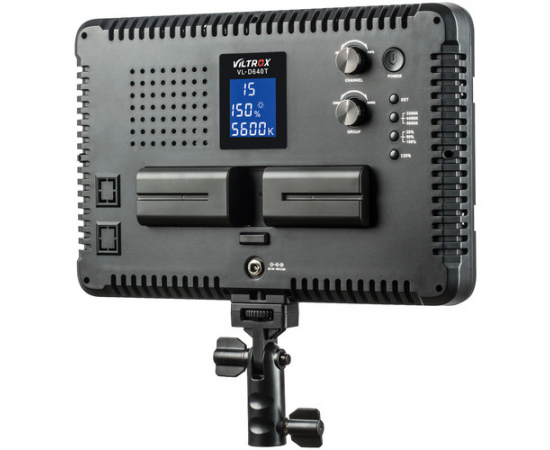 A temperatura da cor e o brilho podem ser controlados localmente na parte traseira do VL-D640T usando os controles intuitivos e a tela LCD ou usando o controle remoto sem fio de 2,4 GHz incluído, que pode controlar várias luzes em 19 grupos e 6 canais.